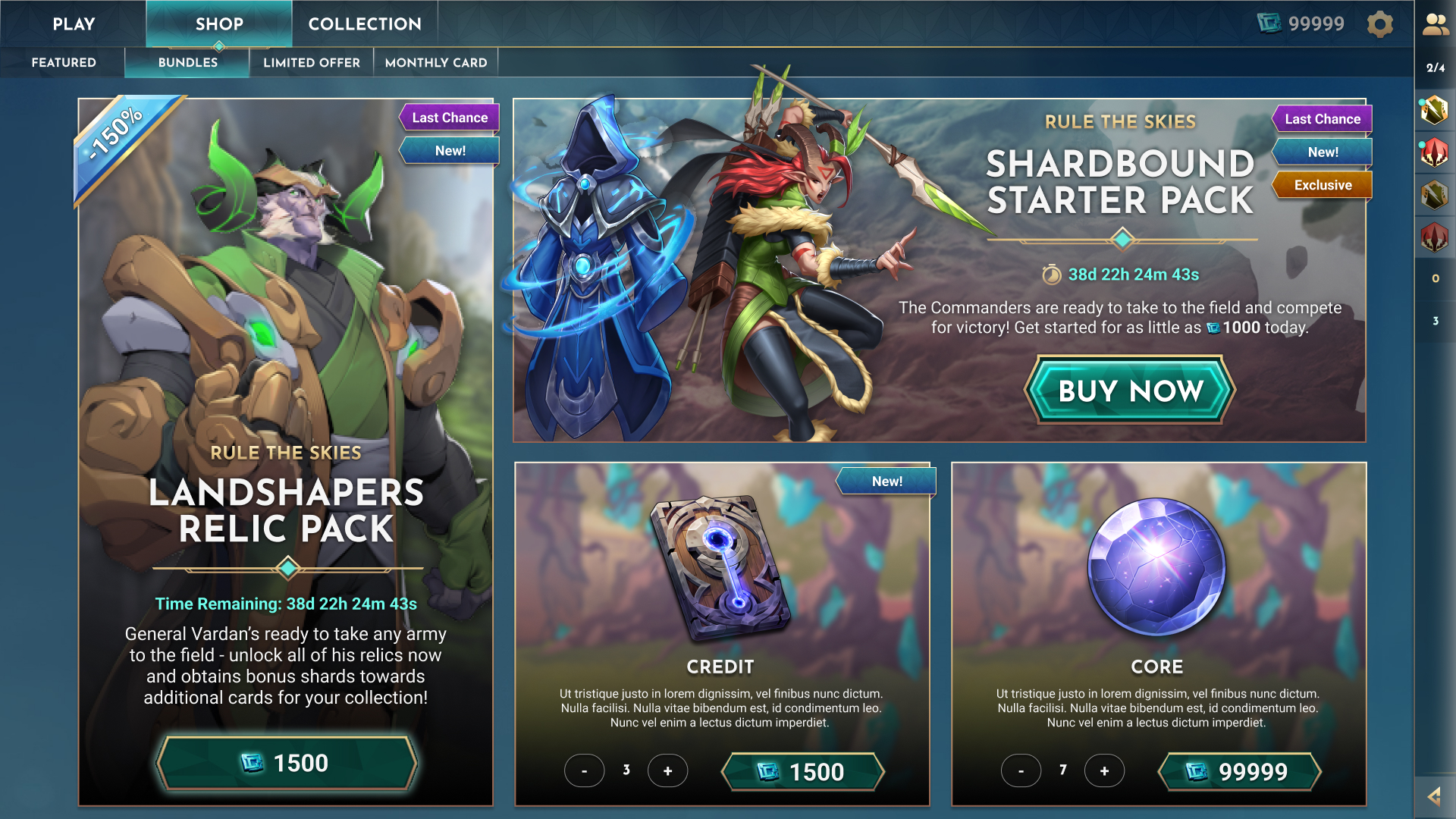 This project focused on redesigning the Premium Store for Shardbound, working closely with product and engineering to define the structure, requirements, and constraints of an in-game storefront. Through research and analysis of player behavior, it became clear that the existing approach would not scale. The store needed to support frequently changing content, promotions, and offers, which led to an early focus on modularity and flexibility.